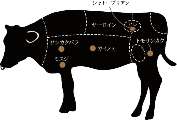 サーロインの内側にある部位。1頭の牛から約3%しか取れない。ほとんど動かさない部位なので、きめが細かく滑らかで柔らかい。