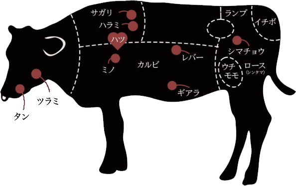 牛の横隔膜の背中にある薄い部分。ハラミ、サガリ共に脂は少なめだが、サガリの方がよりあっさりしている。